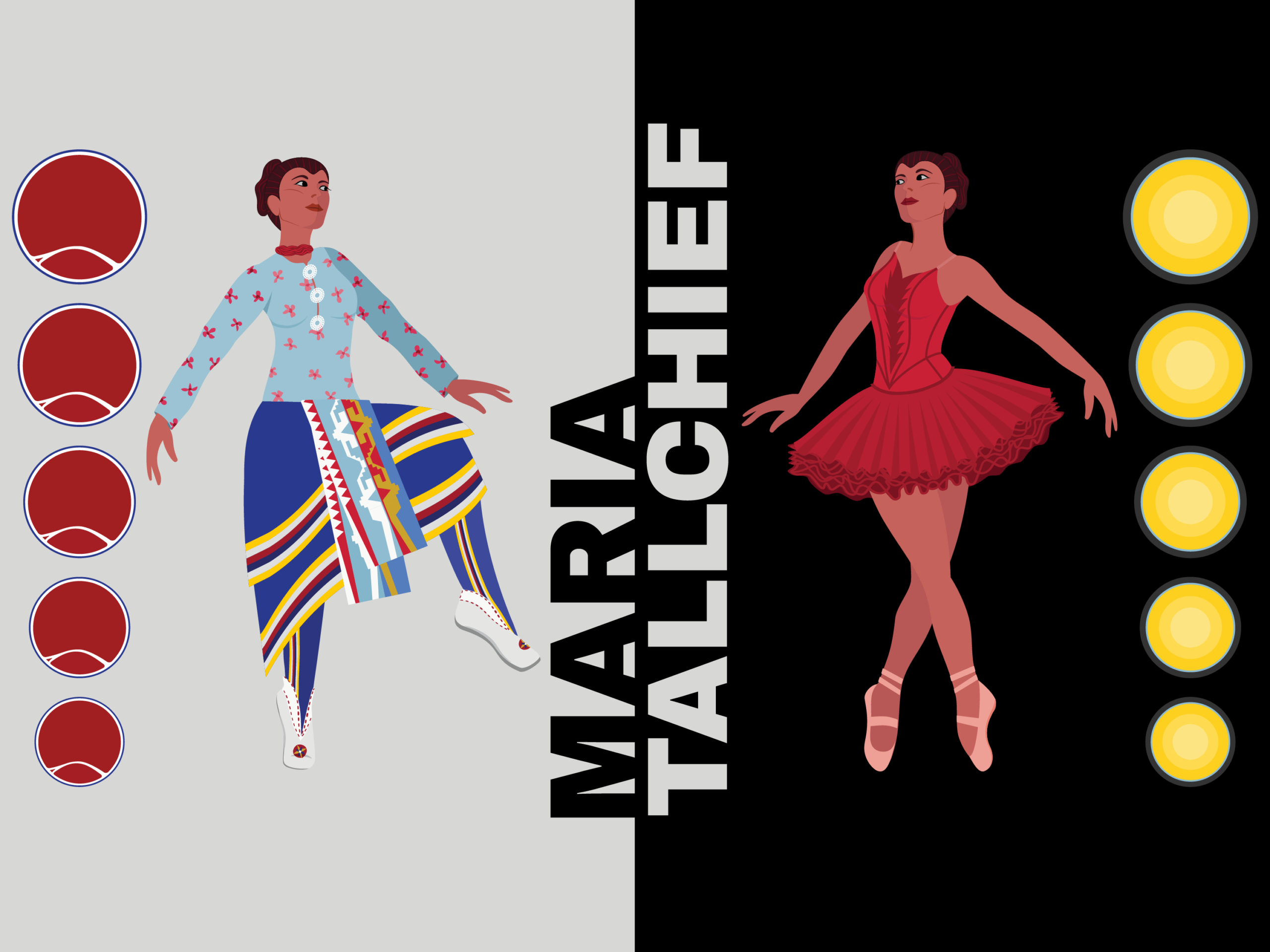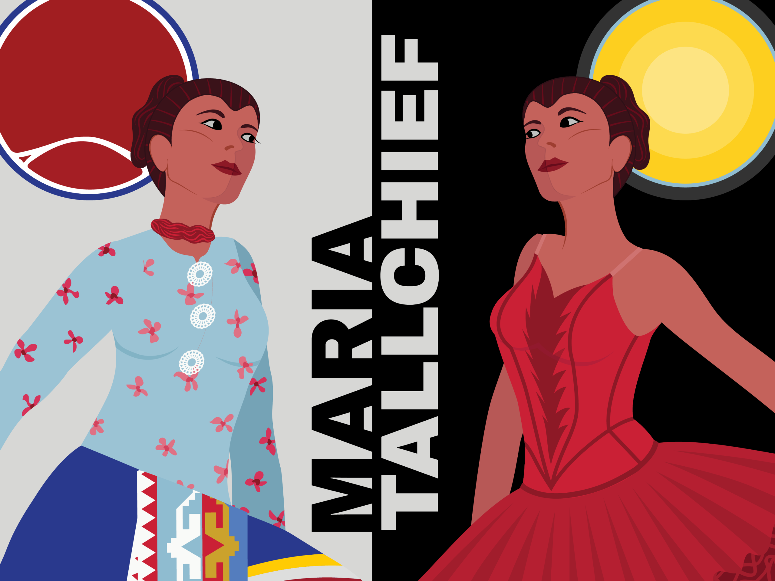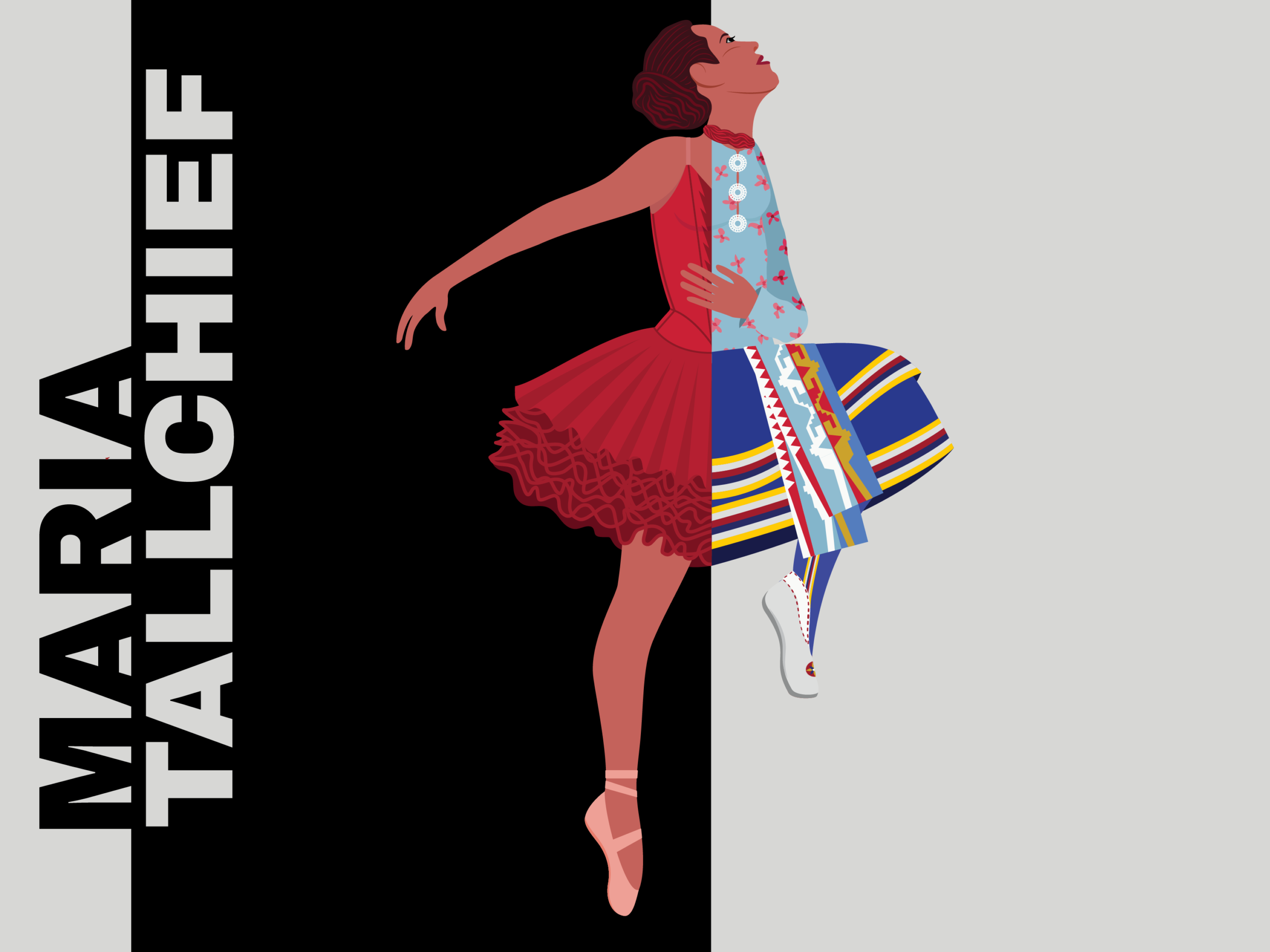 Maria Tallchief, image of black and white background, contrast, bold lettering, illustration of woman, image spit down the middle woman on right ballet, woman on left native culture