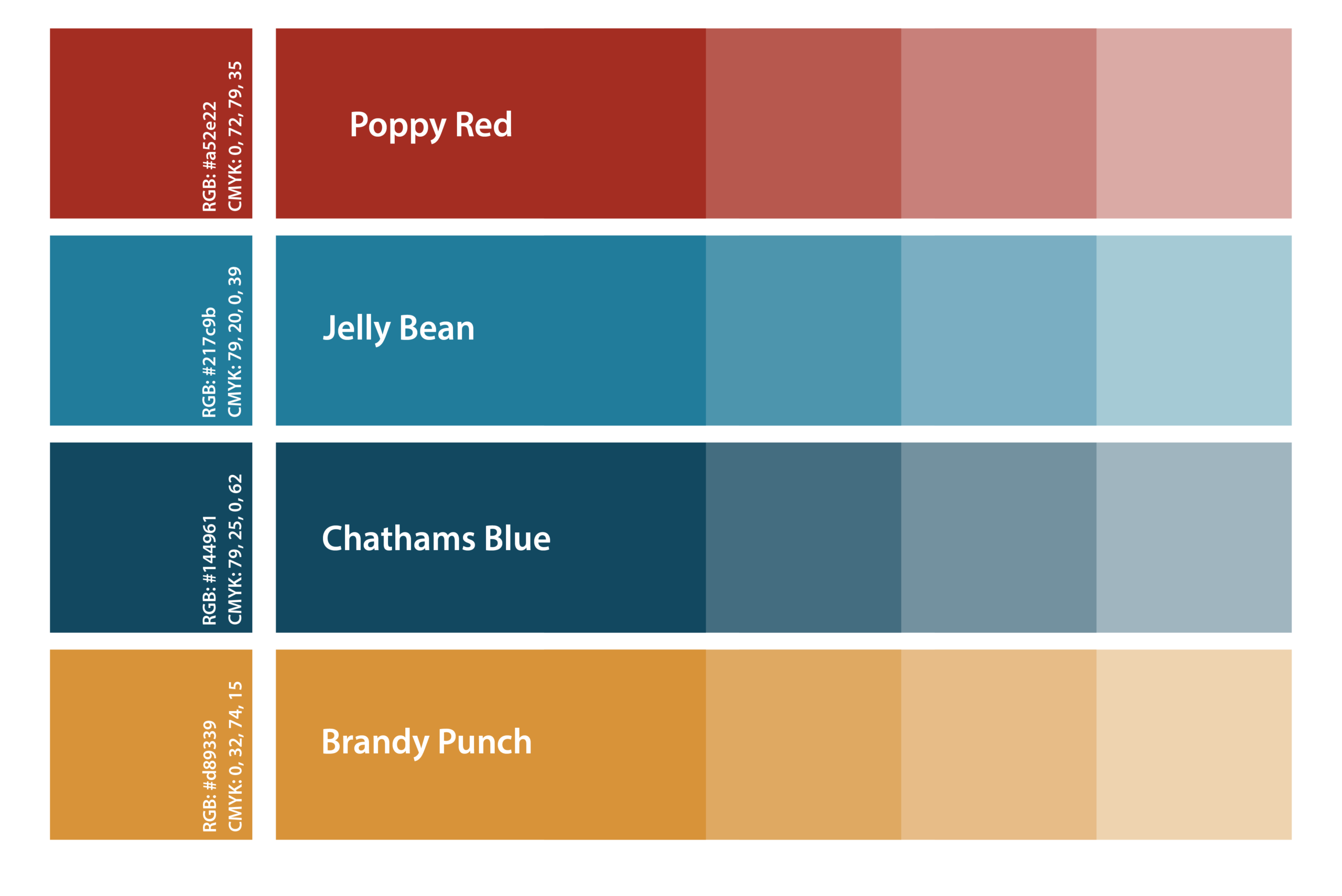 The supporting palette was built to complement the red without competing with it. A warm golden yellow introduces brightness and energy, adding warmth and approachability while remaining rich enough to avoid feeling playful or informal. Two blues, a deep muted navy and a more saturated mid-blue, provide contrast and stability. Together, they balance the warmth of the red and yellow, creating a palette that feels structured, versatile, and cohesive across a range of applications.